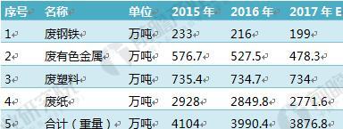 截至2016年底,我國廢鋼鐵、廢有色金屬、廢塑料、廢輪胎、廢紙、廢棄電器電子產(chǎn)品報廢汽車、廢舊紡織品、廢玻璃、廢電池十大類別的再生資源回收總量約為2.56億噸,同比增長3.7%。隨著經(jīng)濟(jì)步入“新常態(tài)”,需求增速放緩,預(yù)計2017年我國再生資源回收總量將穩(wěn)中有升,再生資源價格將有所提高。