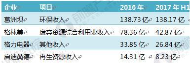 圖表5:2016-2017年我國再生資源行業(yè)龍頭企業(yè)經(jīng)營情況對比(單位:億元)
